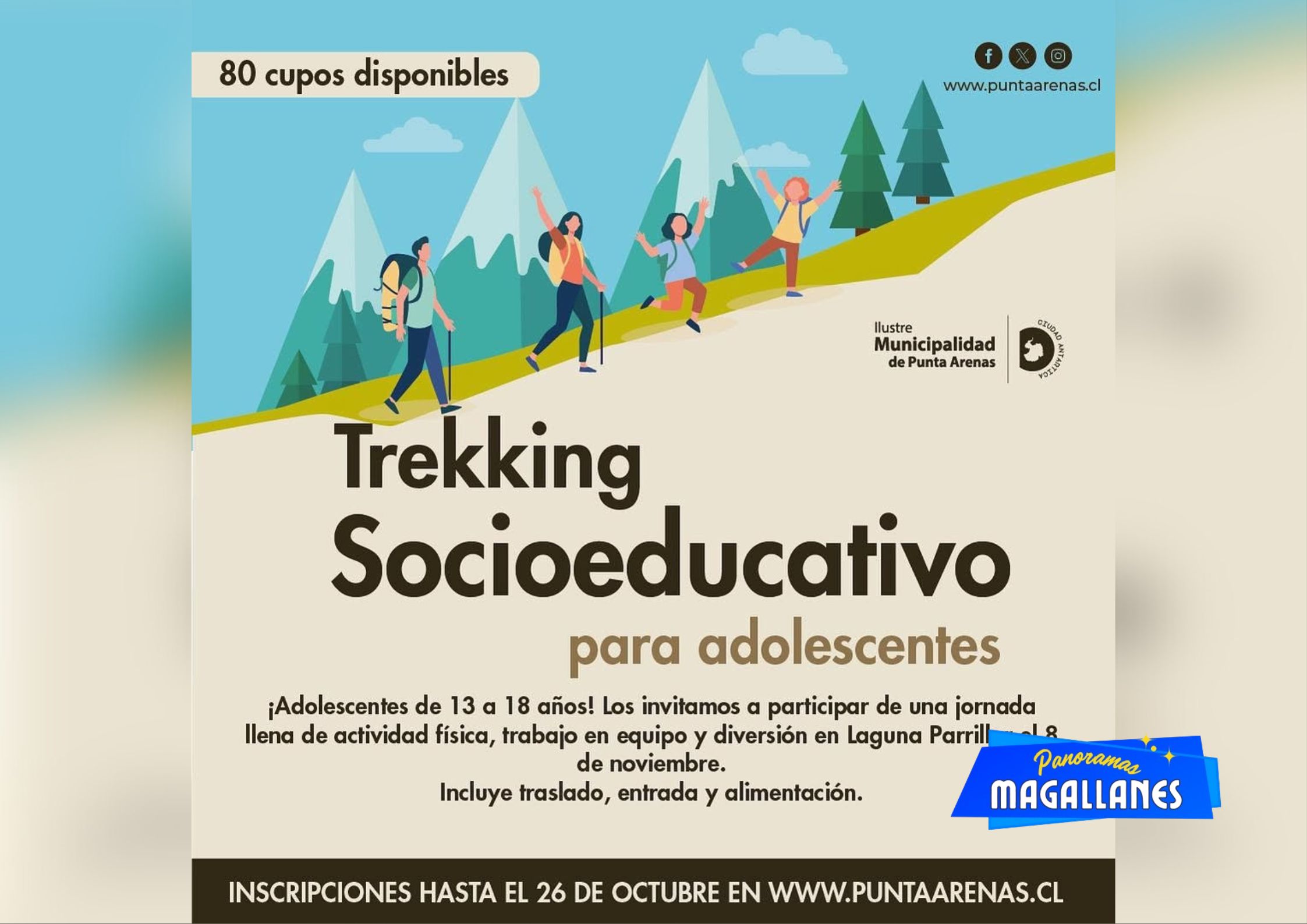 La Municipalidad de Punta Arenas invita a jóvenes de 13 a 18 años a participar del Trekking Socioeducativo en Laguna Parrillar, una actividad diseñada para fomentar la participación, el desarrollo integral y el trabajo en equipo, mientras los participantes disfrutan de la naturaleza y se conectan consigo mismos. 🏞️💪🌱