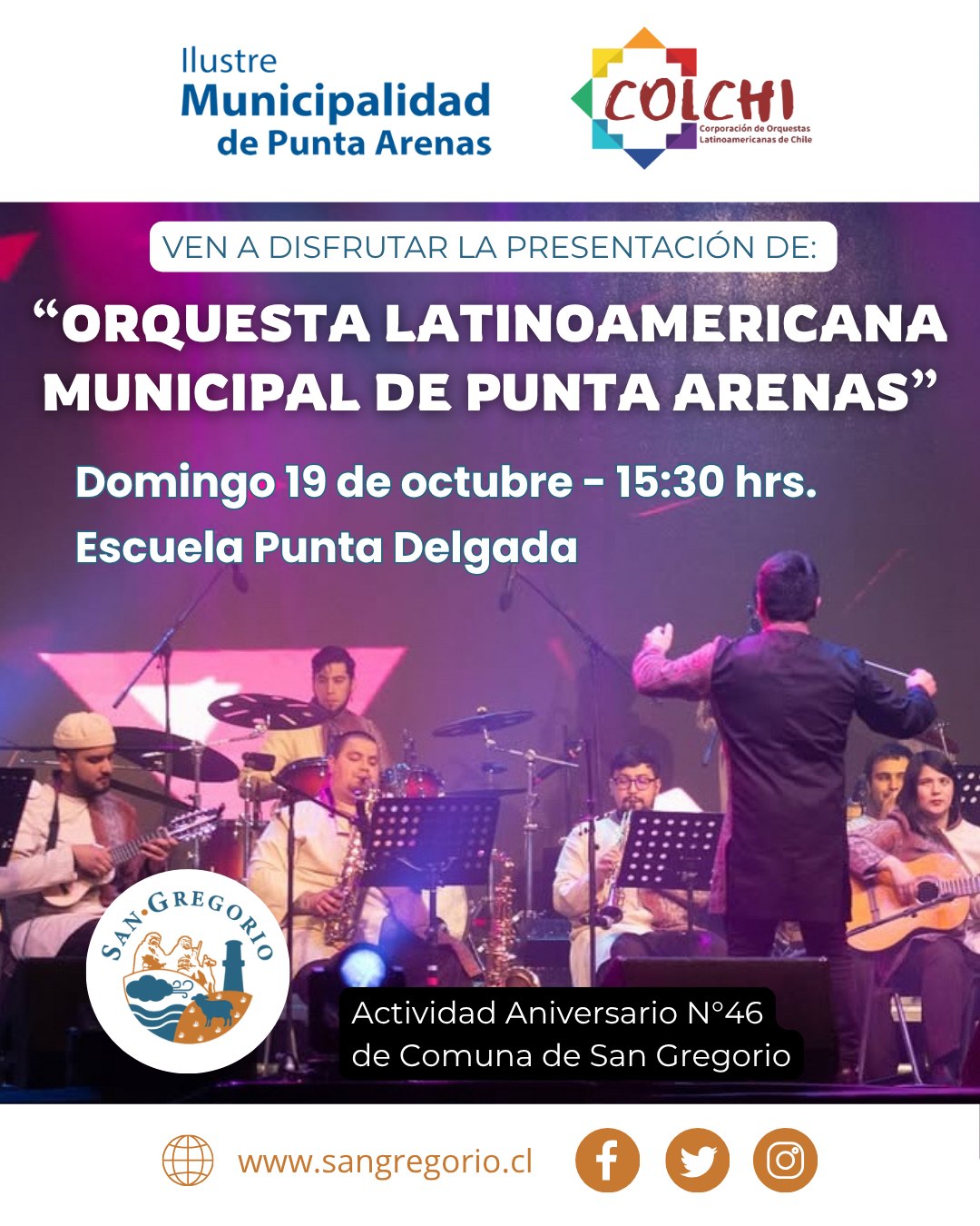 San Gregorio. La comuna de San Gregorio celebrará su 46° aniversario con un concierto gratuito de la Orquesta Municipal de Punta Arenas, que ofrecerá un espectáculo musical para toda la familia este domingo 19 de octubre en la Escuela Punta Delgada.